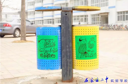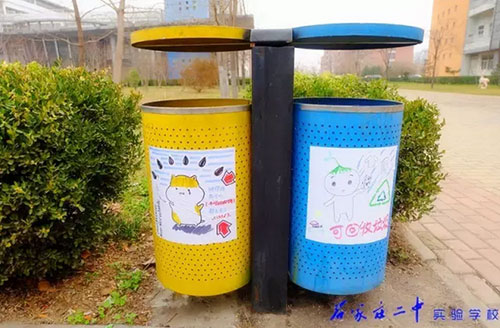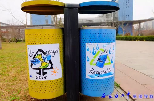 2016年3月18日,石家莊二中實(shí)驗(yàn)學(xué)校2015級高一11班全體66名同學(xué)利用班級值周的時(shí)間,手繪百幅垃圾分類標(biāo)志,為校園垃圾桶換上了“新裝”。18日上午,高一11班教室內(nèi),66位同學(xué)拿起五顏六色的水彩筆,在紙張上設(shè)計(jì)出各種各樣的“垃圾分類”標(biāo)識和警示語,內(nèi)容涵蓋了分類標(biāo)志、垃圾擬人、科普漫畫等,圖面生動有趣。次日下午,同學(xué)們又從教室奔向校園每個角落,將精心繪制的圖案張貼在校內(nèi)所有的垃圾桶上,提醒過往師生將垃圾分類,維護(hù)我們共同的家園。