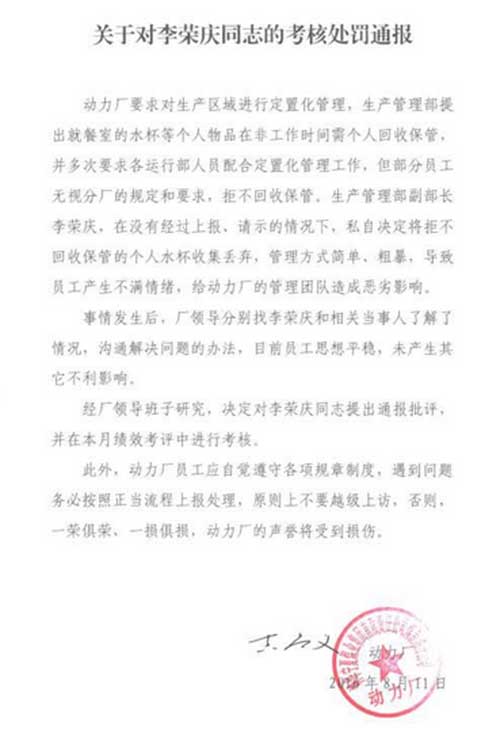 動(dòng)力廠(chǎng)一名工作人員提供的一份《關(guān)于對(duì)李榮慶同志的考核處罰通報(bào)》顯示,該廠(chǎng)生產(chǎn)管理部提出就餐室的水杯等個(gè)人物品在非工作時(shí)間由個(gè)人回收保管,但部分員工無(wú)視此規(guī)定和要求,拒不回收保管。李榮慶在沒(méi)有經(jīng)過(guò)上報(bào)請(qǐng)示的情況下,私自決定將拒不回收保管的個(gè)人水杯收集丟棄,管理方式簡(jiǎn)單粗暴,導(dǎo)致員工產(chǎn)生不滿(mǎn)情緒,給動(dòng)力廠(chǎng)的管理團(tuán)隊(duì)造成惡劣影響。