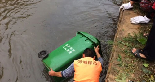無(wú)辜垃圾桶被人拋下河 環(huán)衛(wèi)工人冒險(xiǎn)打撈