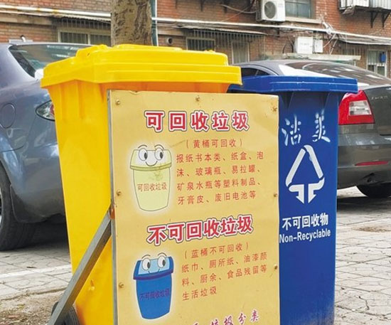 小區(qū)每棟居民樓前都擺放了黃色和藍色兩種顏色的塑料戶外垃圾桶,其中黃色垃圾桶前還用三角鐵架固定了提示牌,上面有清晰詳盡的使用說明,標明黃桶收集“可回收垃圾”,包括報紙書本類、紙盒、泡沫、玻璃瓶、易拉罐、礦泉水瓶等塑料制品以及牙膏皮、廢舊電池等;藍桶收集“不可回收垃圾”,包括紙巾、衛(wèi)生紙、油漆顏料、廚余、食品殘留等生活垃圾。