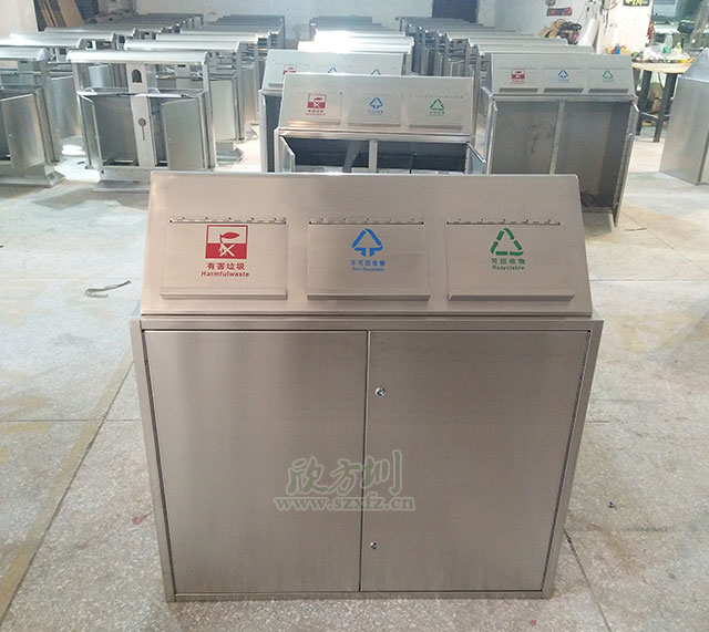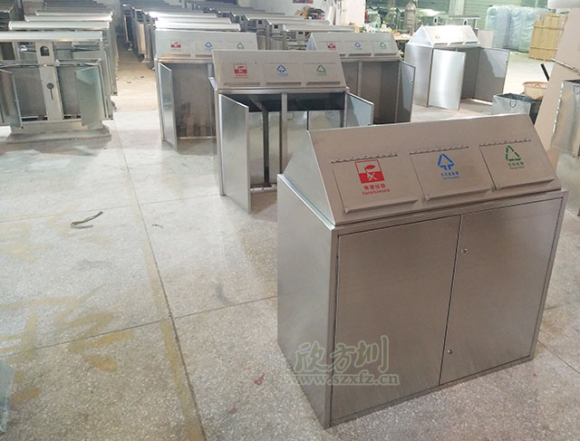 • 產品材質:欣方圳環保分類垃圾桶采用新型的剪鈑下料,折彎、沖壓、焊接、打磨、等工藝: 表面經過除油、噴砂防銹處理后,再進行酸洗磷化處理;表面清理干燥后整體進行靜電噴涂,涂層厚度達到 90um,經過流水線高溫固化爐固化后再出爐冷卻,加工后的塑粉附著力強,不易剝落;