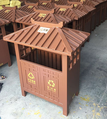 欣方圳景區(qū)仿古鋼制垃圾桶,桶頭部分屋檐造型,造型優(yōu)美、古色古香。