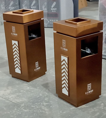 方形單桶設計用于樓盤瓜果紙屑作為果皮箱使用,兩面開口作為果皮垃圾投口,另兩面桶身上做裝飾效果,不銹鋼方形電鍍垃圾桶四面絲印樓盤LOGO。桶頭打開可取內桶收運垃圾,頂部嵌入煙灰盅放小石子滅煙和煙蒂收集使用,表面做電鍍效果高檔美觀!
