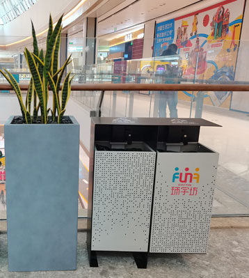 欣方圳商場不銹鋼烤漆景觀分類垃圾箱現(xiàn)場擺放圖